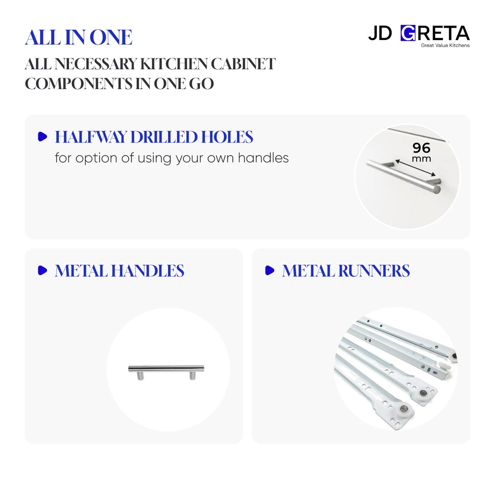 JD Greta base cabinets are available in two options: adjustable and fixed. You can choose the one that best suits your needs.