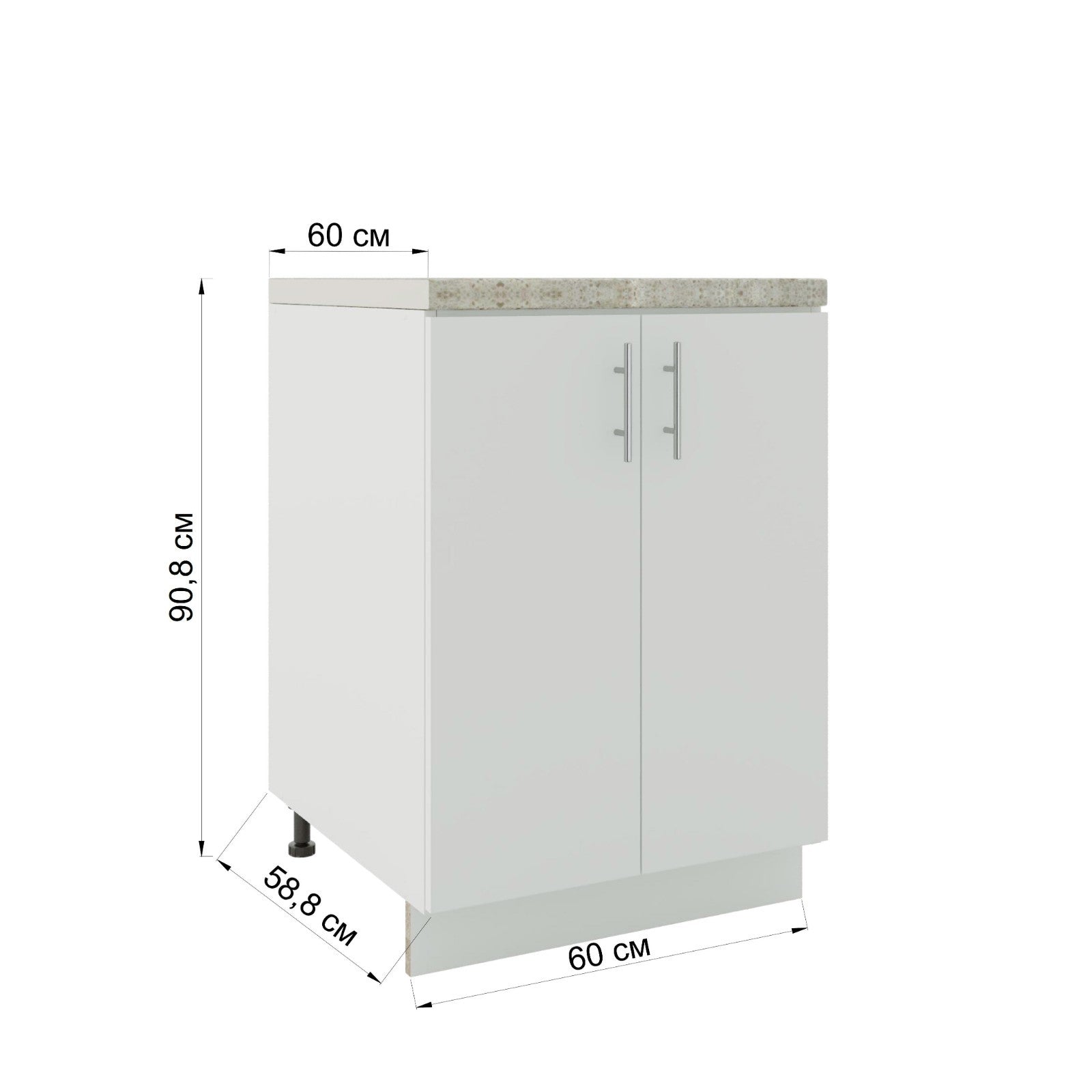 We offer two size options for base cabinets. The non-adjustable version is shorter and less deep, while the adjustable version closely matches UK standard dimensions.