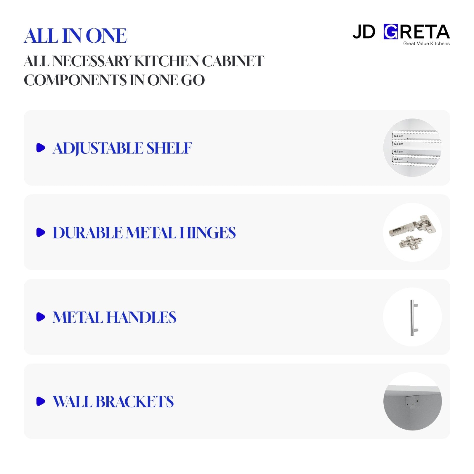 JD Greta base cabinets are available in two options: adjustable and fixed. You can choose the one that best suits your needs.