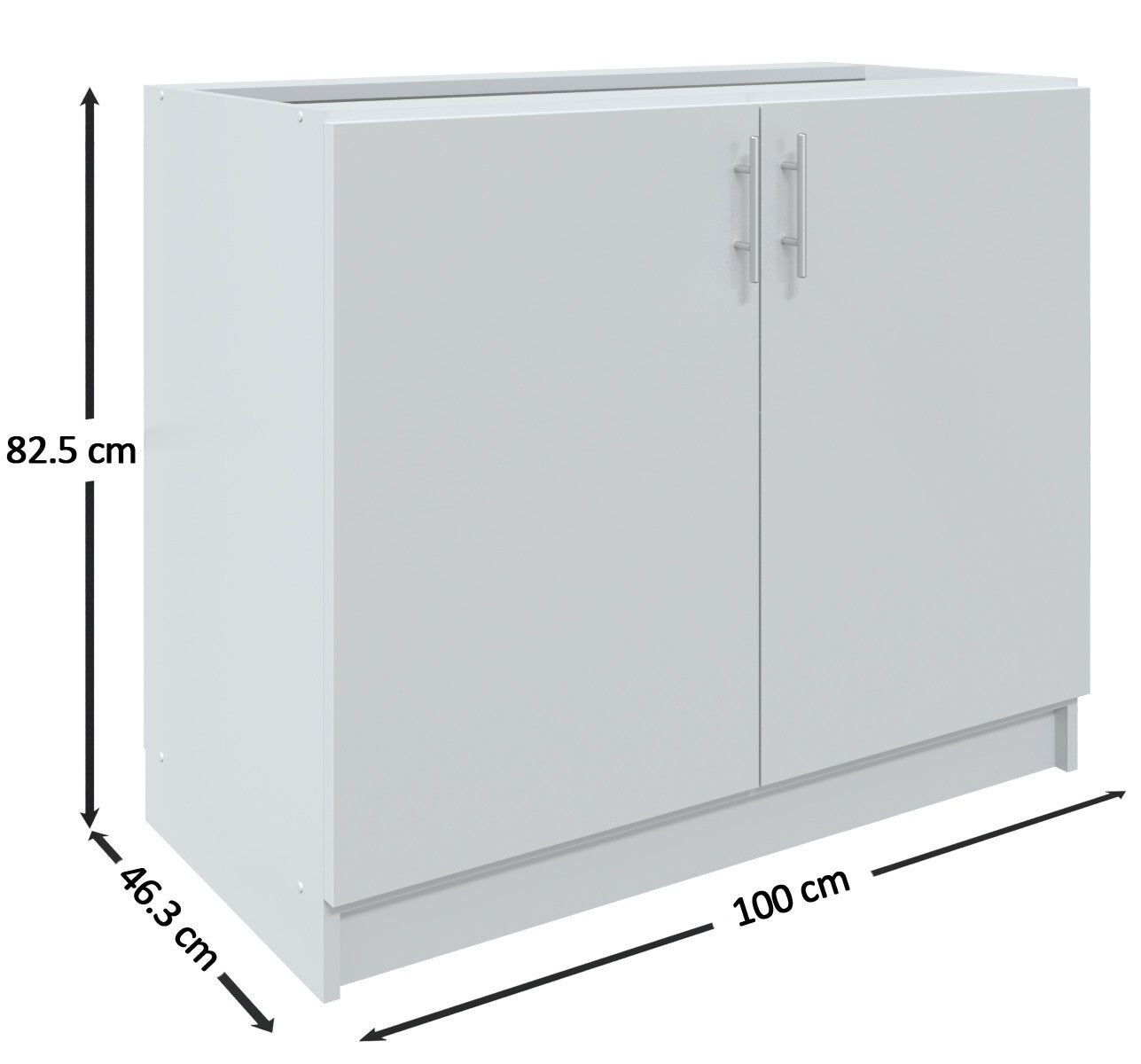 We offer two size options for base cabinets. The non-adjustable version is shorter and less deep, while the adjustable version closely matches UK standard dimensions.