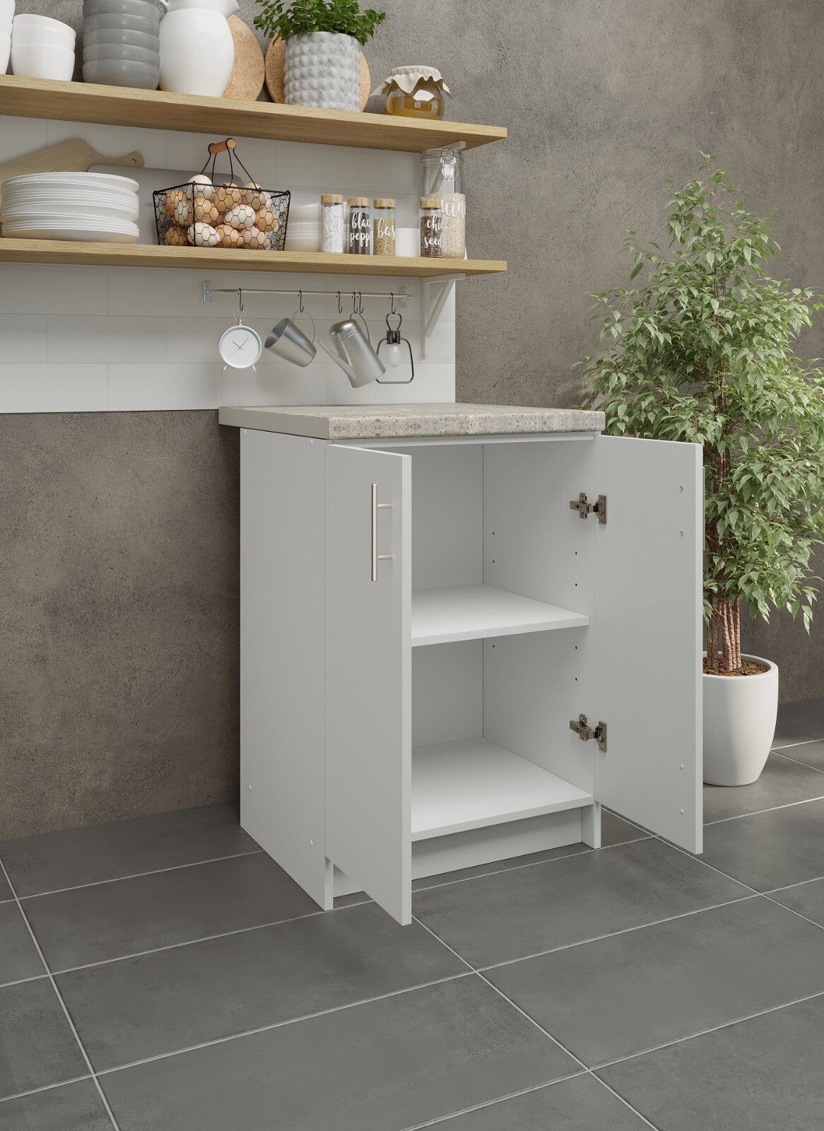 JD Greta base cabinets are available in two options: adjustable and fixed. You can choose the one that best suits your needs.
